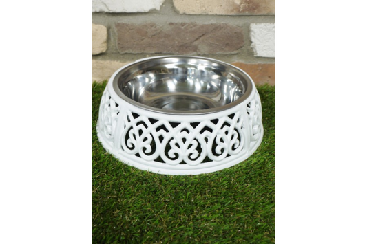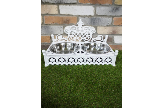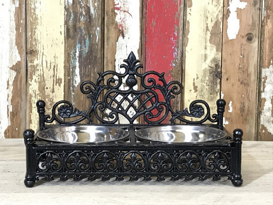 Ornate Cast Iron Double Medium Small Dog, Pet Dish Stand & Stainless 7¾" Bowls