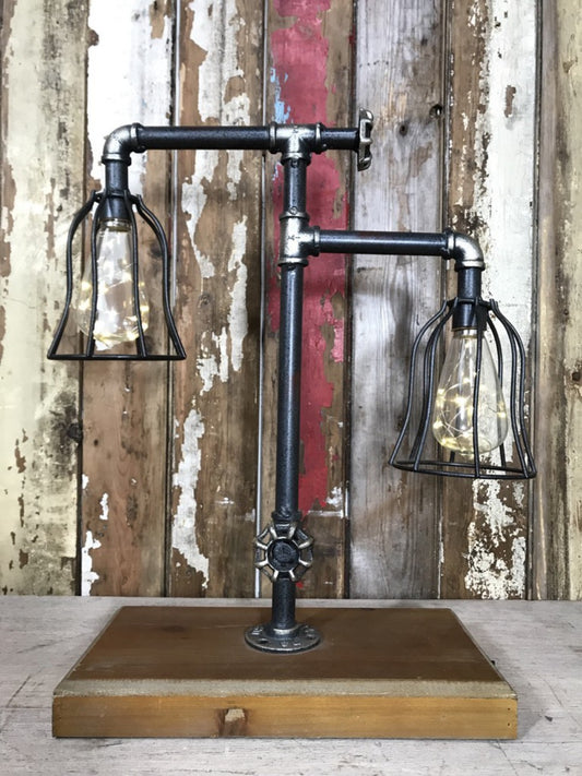 Industrial Style Pipe Double Low Level Lighting Battery Light On Wooden Plinth