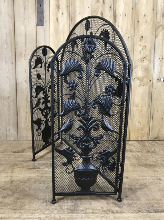 Black Wrought Iron Steel Folding Stove Fire Guard Vase, Birds & Leaves Design