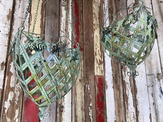 Set Of Two Antique Green Leaf Lattice Hanging Baskets Small & Large Lovely