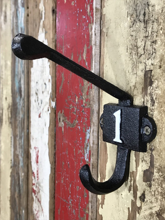 Heavy Solid Cast Iron Black Double Wall Coat Hook with Number 1 in White