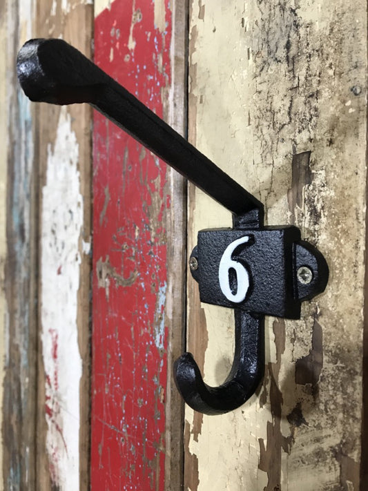 Heavy Solid Cast Iron Black Double Wall Coat Hook with Number 6 in White