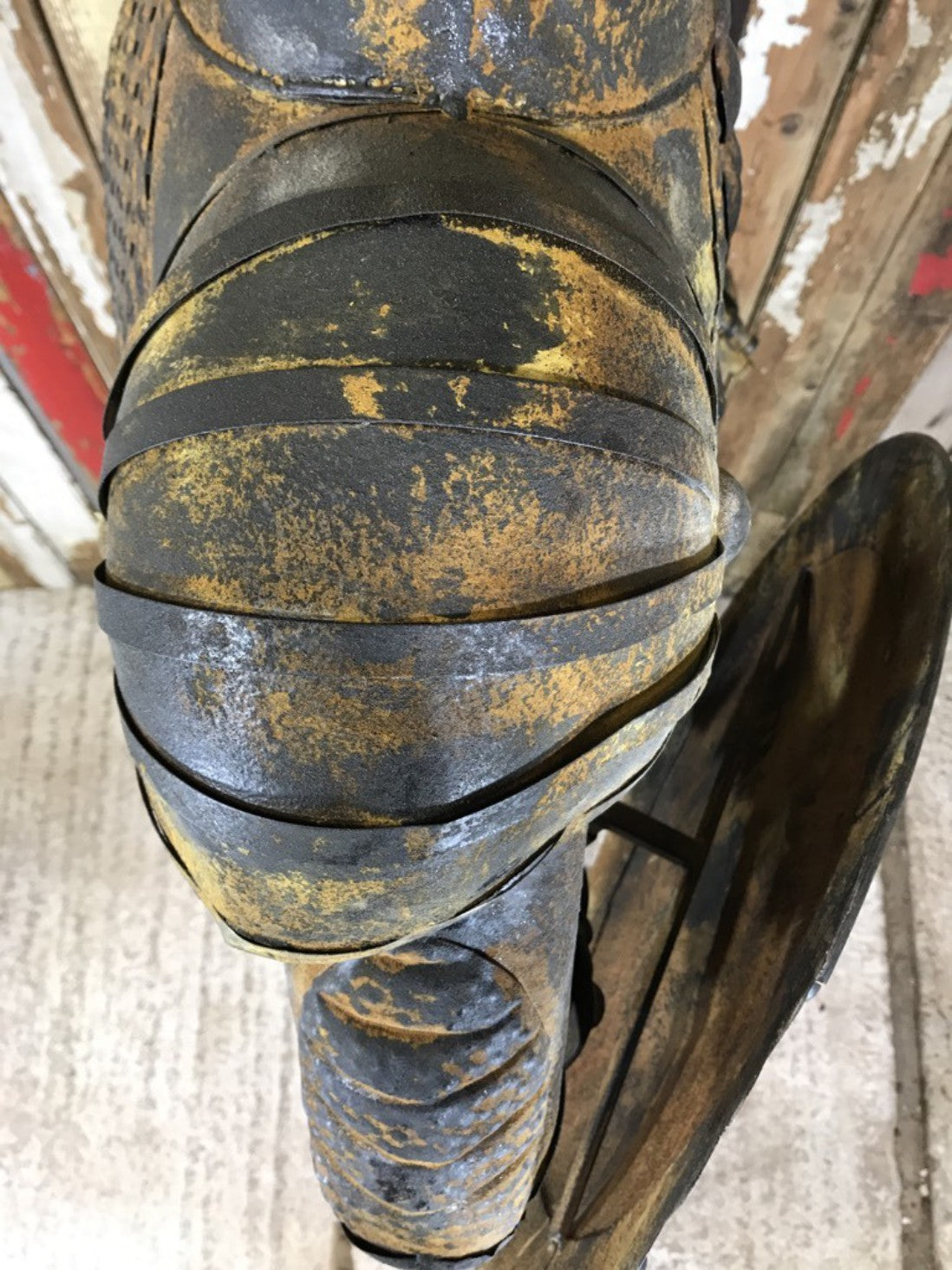 This handsome freestanding full size chap, probably depicting medieval times, is hand made from pressed steel shaped pieces, holding a round shield and a long tube handle axe.