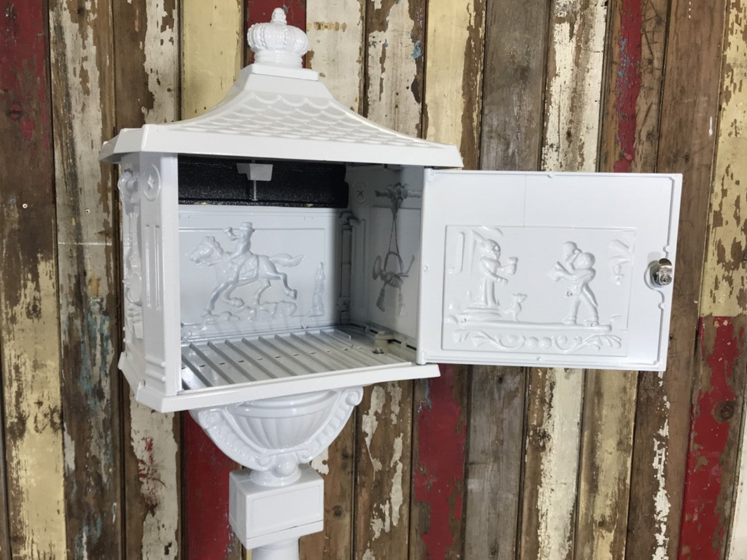 This white horseman post box has 4 fixing holes to enable bolting to the ground