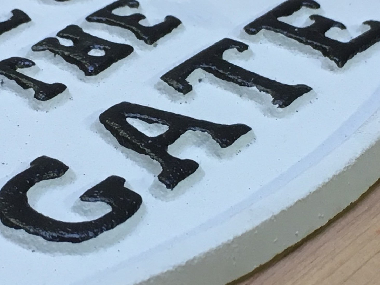 Traditionally made cast iron sign with the text " PLEASE CLOSE THE GATE" in raised black capital letters on a white background