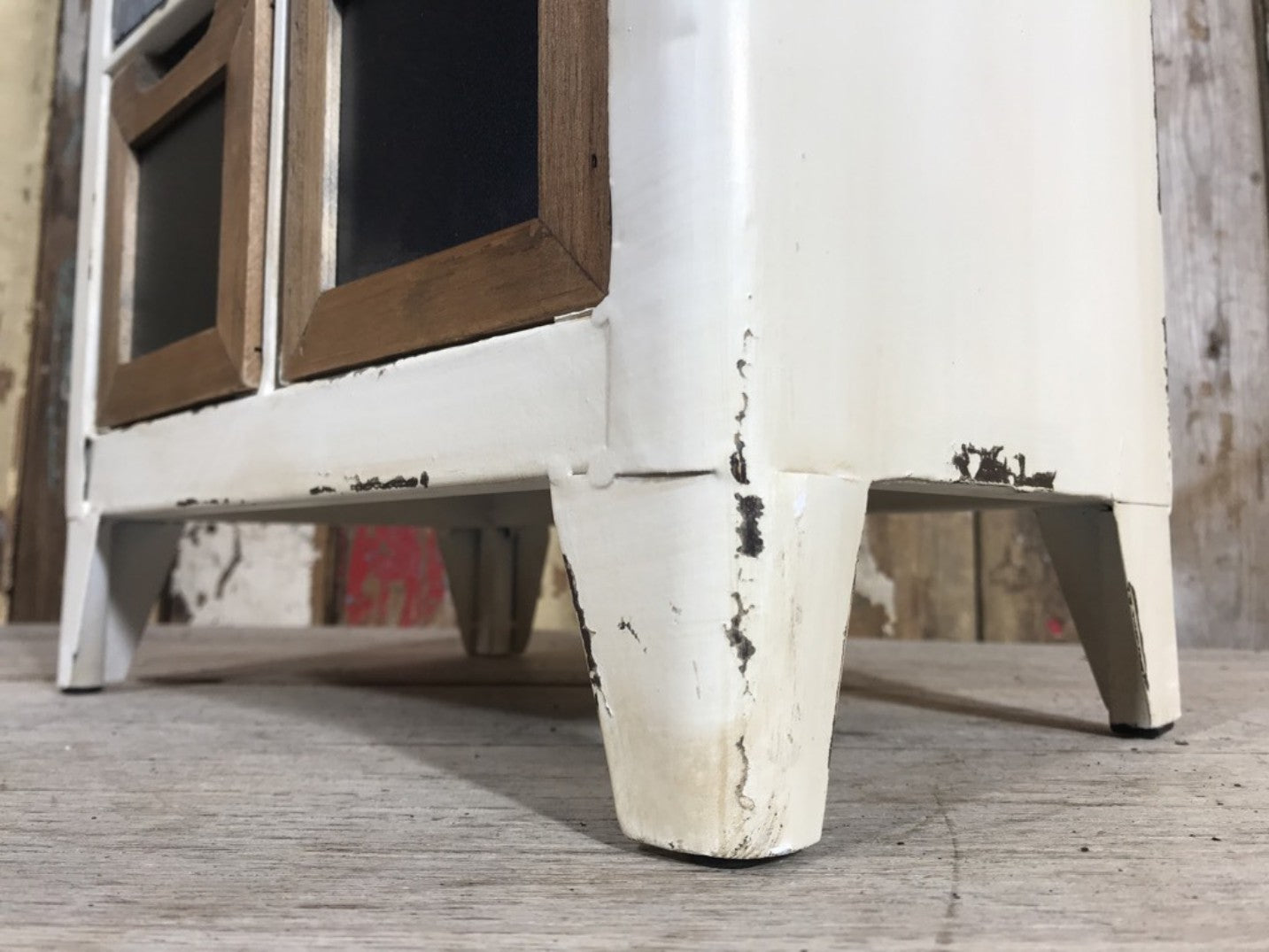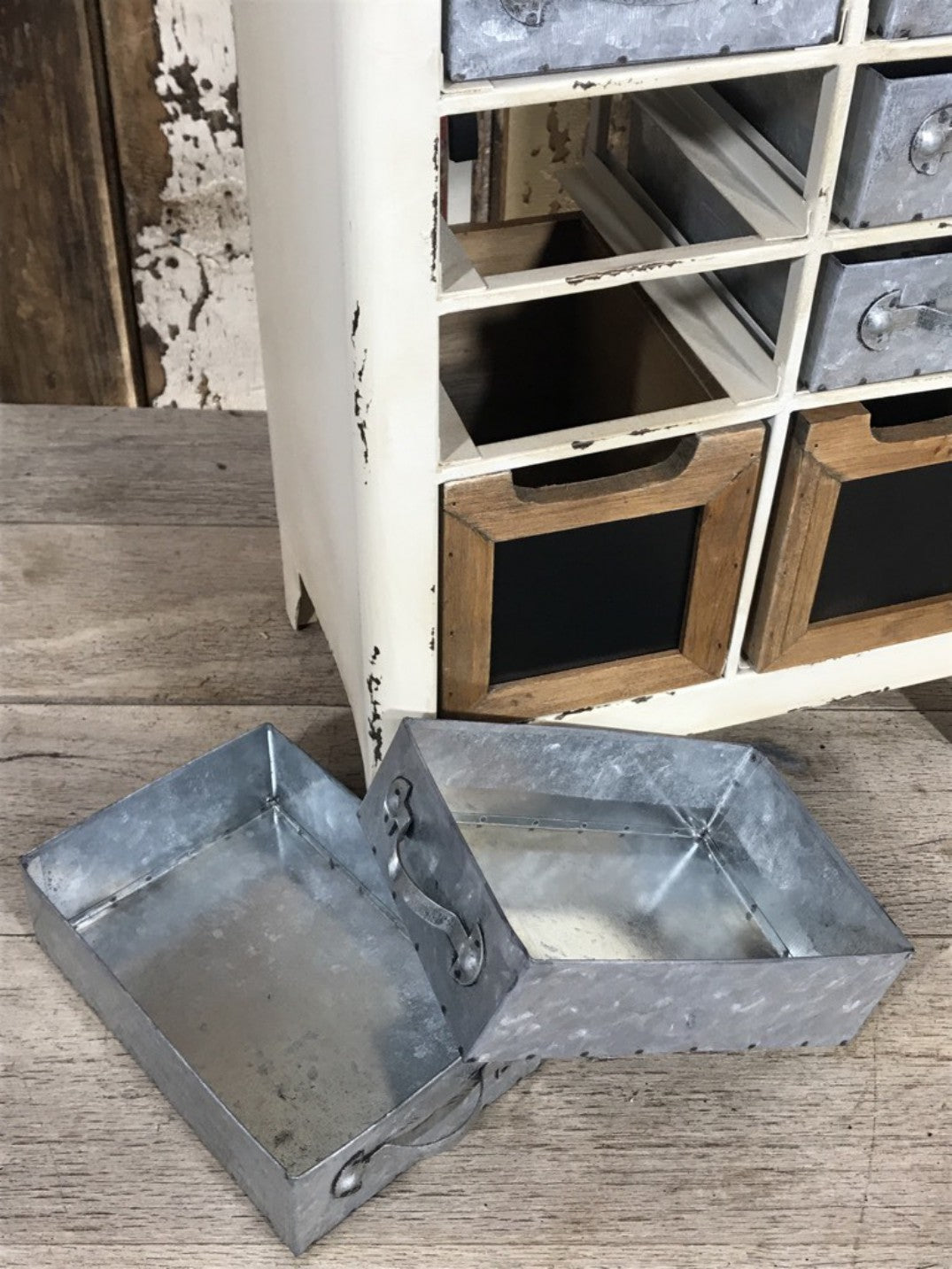 12 metal drawers & 2 wooden drawers that are larger with chalkboard front