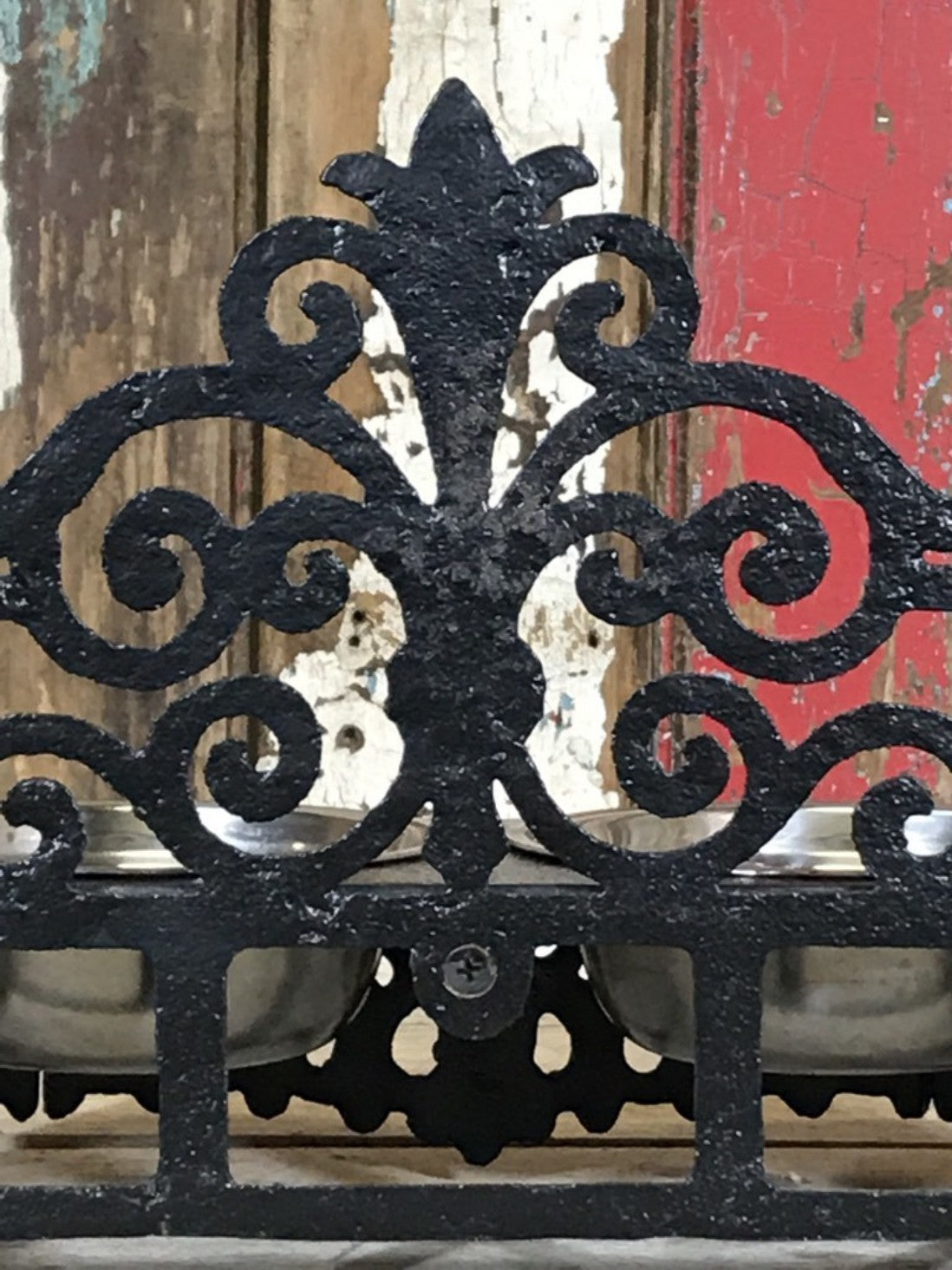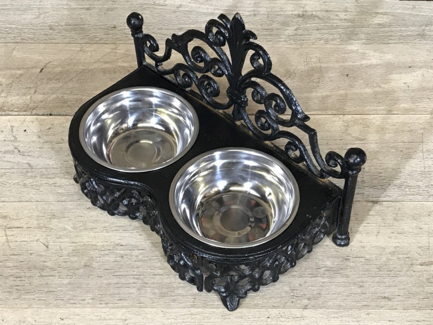 Solid ornate black cast iron stand with 2 removable stainless steel bowls for pets.