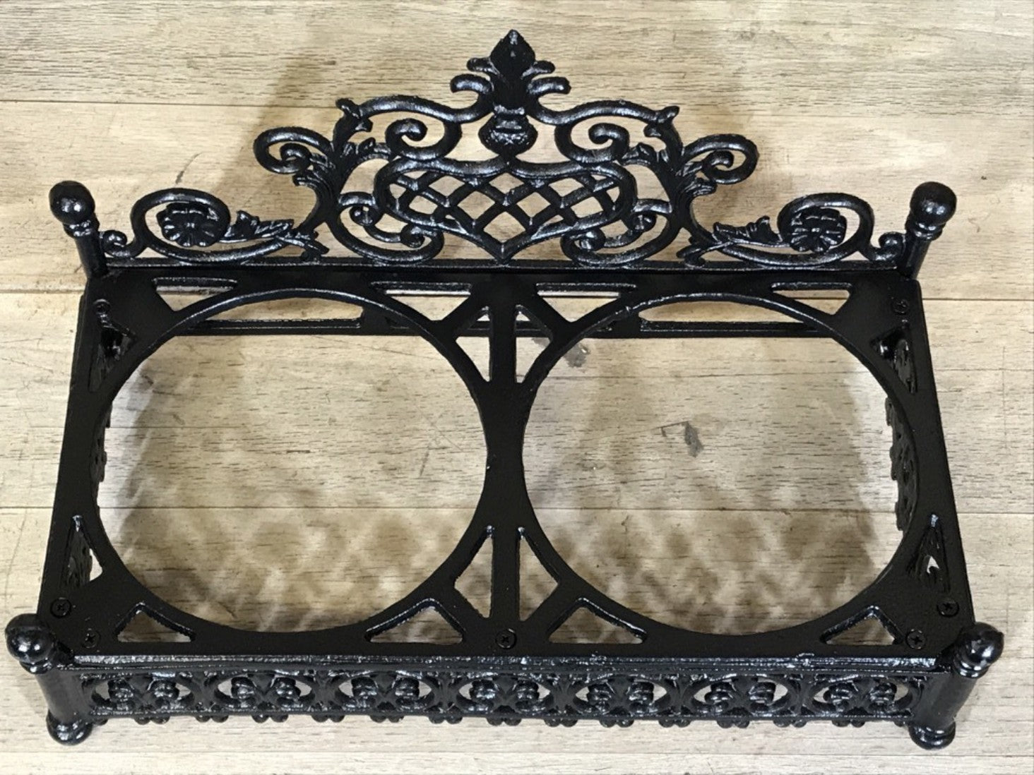 Solid ornate black cast iron stand with 2 stainless steel bowls for pets especially dogs.