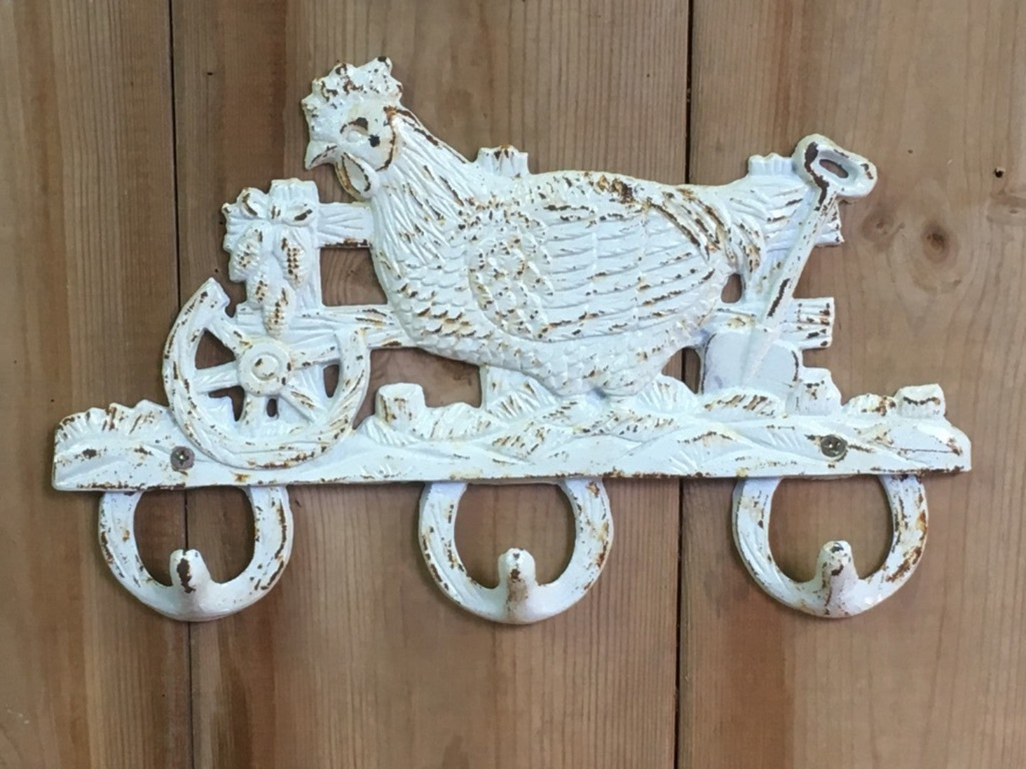 Shabby chic cast iron rack of 3 coat hooks featuring a hen in a farmyard setting